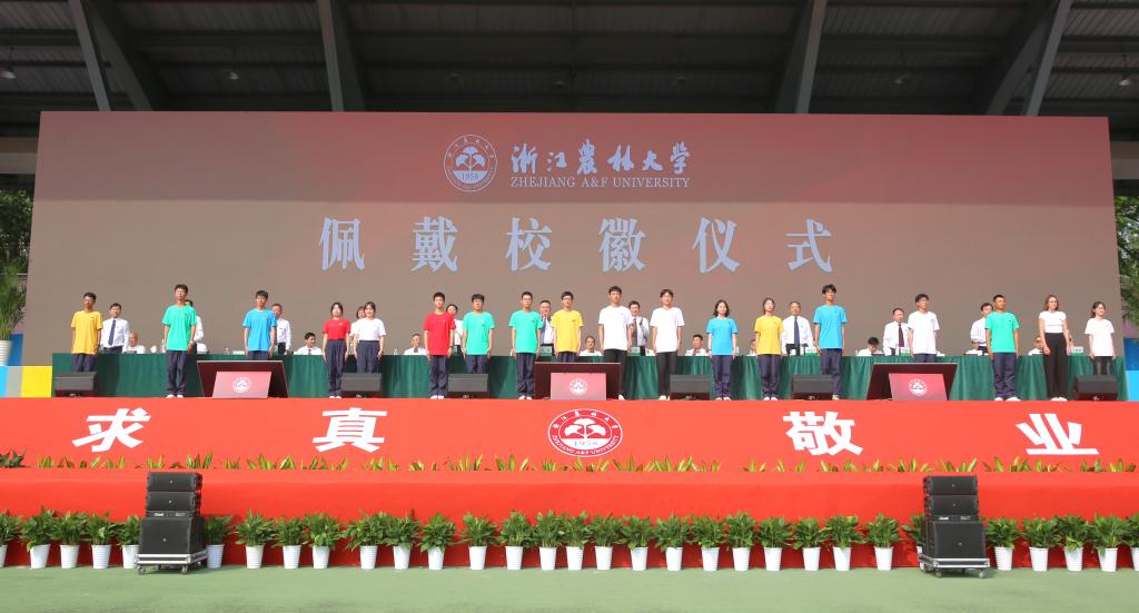 校領(lǐng)導(dǎo)為新生代表佩戴校徽,全體新生共同佩戴校徽。校徽是學(xué)校的象征與標(biāo)識,更是全體學(xué)生與教職工的榮耀與自豪。戴上校徽,新生們就永遠(yuǎn)烙上了浙農(nóng)林大印記,從此與學(xué)校同呼吸、共命運(yùn)。