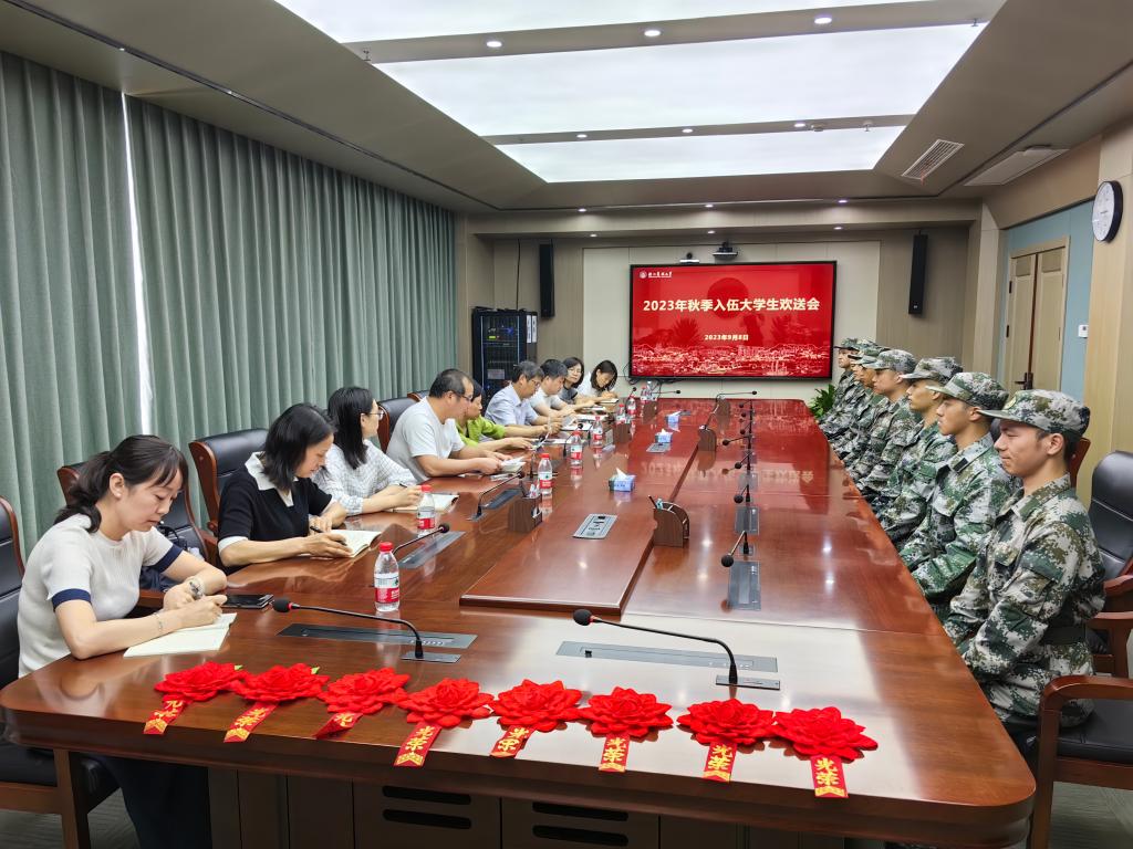 9月8日,2023年秋季入伍大學生歡送會在行政樓316召開,校黨委副書記施美紅、人武部相關負責人及各新兵學院副書記、輔導員代表出席歡送會。