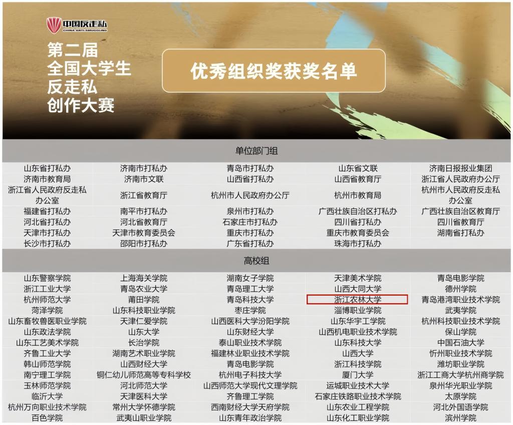 近日,第二屆全國大學生反走私創作大賽獲獎名單、首屆“錢江杯”大學生反走私創作比賽獲獎名單先后公布。在第二屆全國大學生反走私創作大賽中,我校獲高校組優秀組織獎,3件學生作品獲優秀獎,郭冰老師獲優秀指導教師獎。在首屆“錢江杯”大學生反走私創作比賽中,我校獲優秀組織獎,文法學院譚解等創作的《反走私風云》獲得視頻類作品三等獎,另有11件學生作品獲優秀獎,郭冰、周雪嶠2名老師獲優秀指導教師獎。